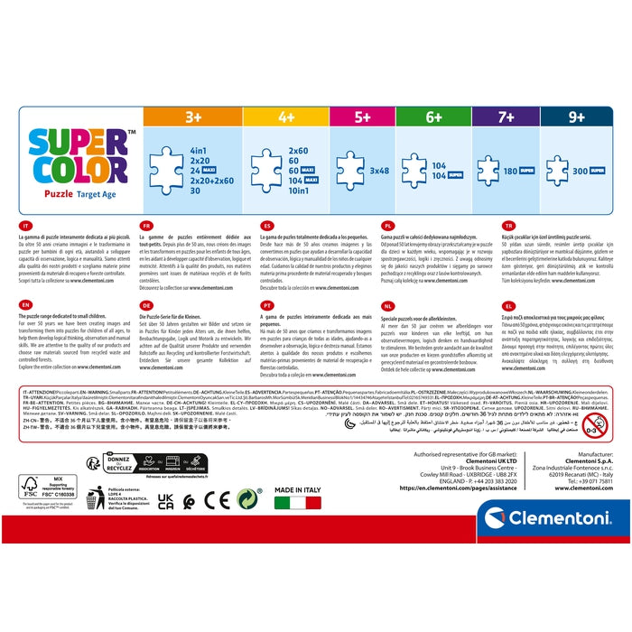Çevre farkındalığına ciddi şekilde değer veren Clementoni, geri dönüştürülmüş malzemeleri kapsamlı şekilde kullanır ve kirletici içeren bileşenlerden uzak durur. İtalya’da üretilmiştir.